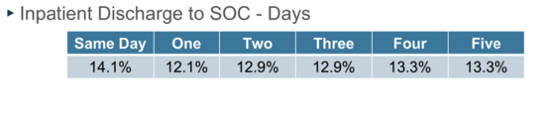 The readmission rate for patients whose first home health visit occurs on the same day that they are discharged may be higher the readmission rate for patients whose first home health visit occurs one, two, three, four or five days after discharge due to a patient’s higher acuity, Clayton added.